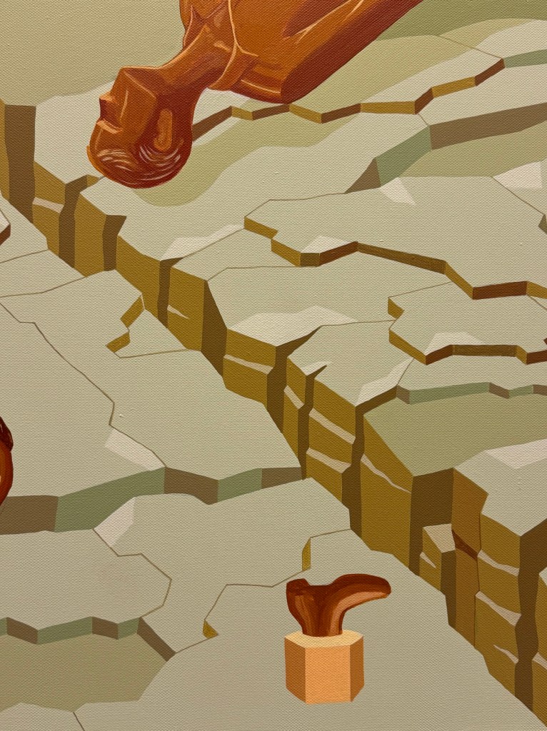 Not too ashamedly, Scaria says that humans have fucked it. The roads in his paintings that loop around and into nowhere are not figments of some dystopian vision. They are the same roads I have just used to get to here. I even have a photograph, (taken without expectation) exactly 60 minutes before. Now it is in front of me, painted.