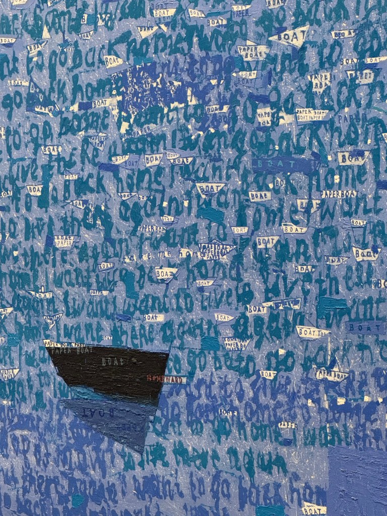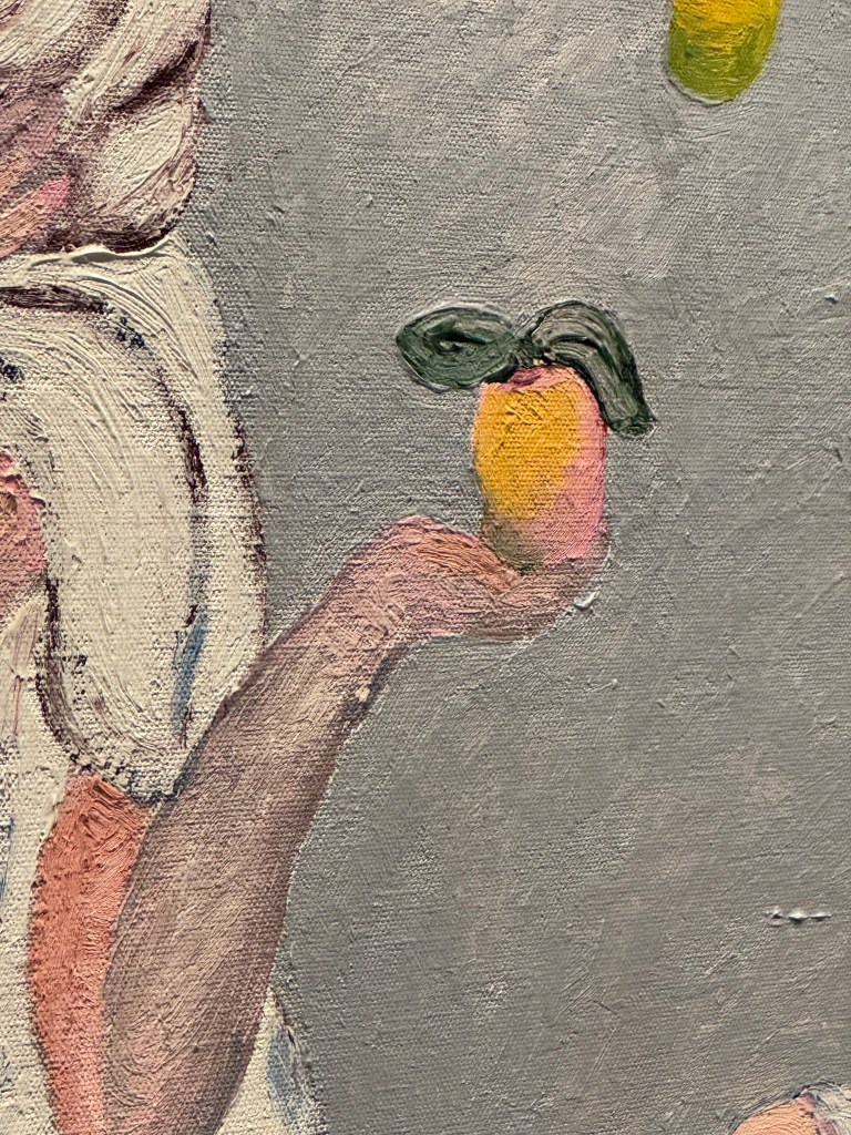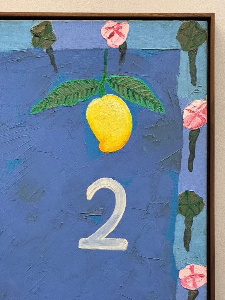 Singh’s use of text often disarms and enables her viewers, who, with such an injunction, are given license to look freely. There is such confidence in such a confession, or rather such a thesis of faultiness and not following. Indeed self-assuredness is writ large throughout, alongside which it is hard not to feel like an imperfect viewer. But this is faulty, she affirms, as if to say this map doesn’t actually work, as if to say this is a painting, and that it might not have an entirely objective utility or, further, be completely representative of anything at all. It is a sentiment that makes me want to start all reviews in the same vein; this text is faulty, do not follow it.