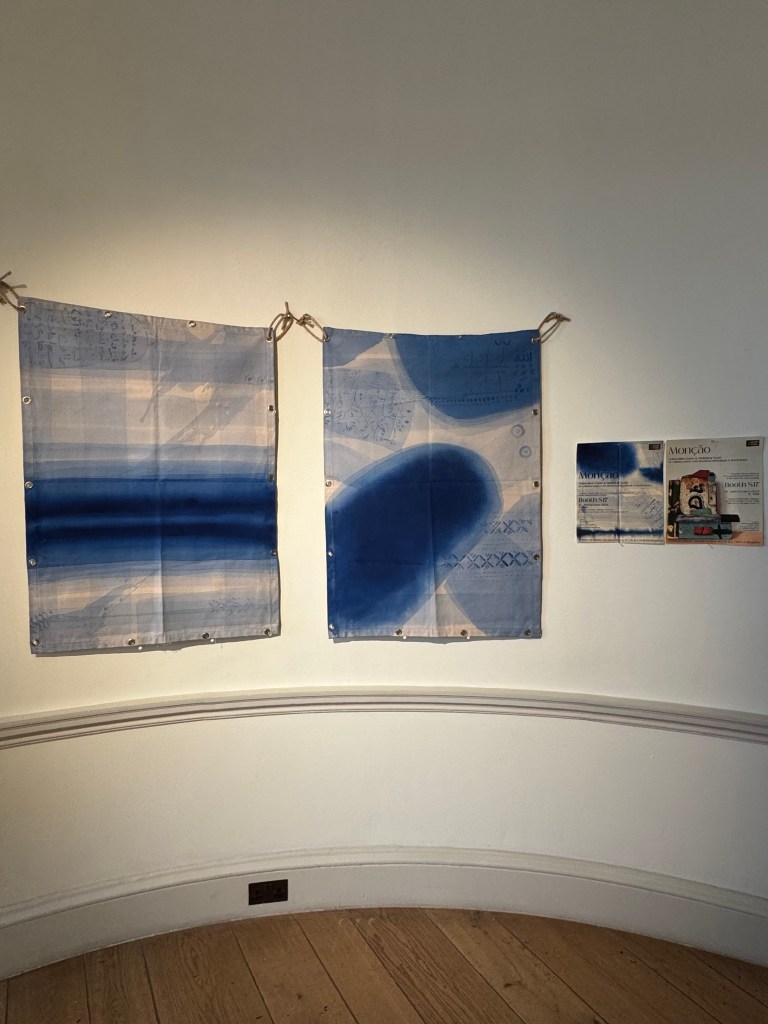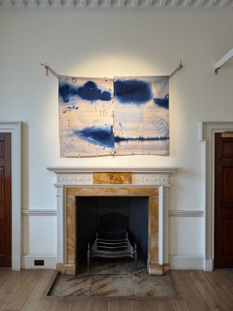 So it is only fair to say that when I look at them now I do so with that in mind. The context I had given, at a very lively c.1.75x speed for my Sunday rusher, was that Mukhtar is from a family with a deep and extended history of sailing. They sailed people from Mumbai to various parts of Africa; Tanzania, Mozambique etc, through which it is likely the gentle dispersion of Islam took place. He works on sail cloth, these works bordered by the eyelets that help such a connection with the sea, and his colour is indigo. We’d hung them on thick bits of rope. The combination is highly maritime.